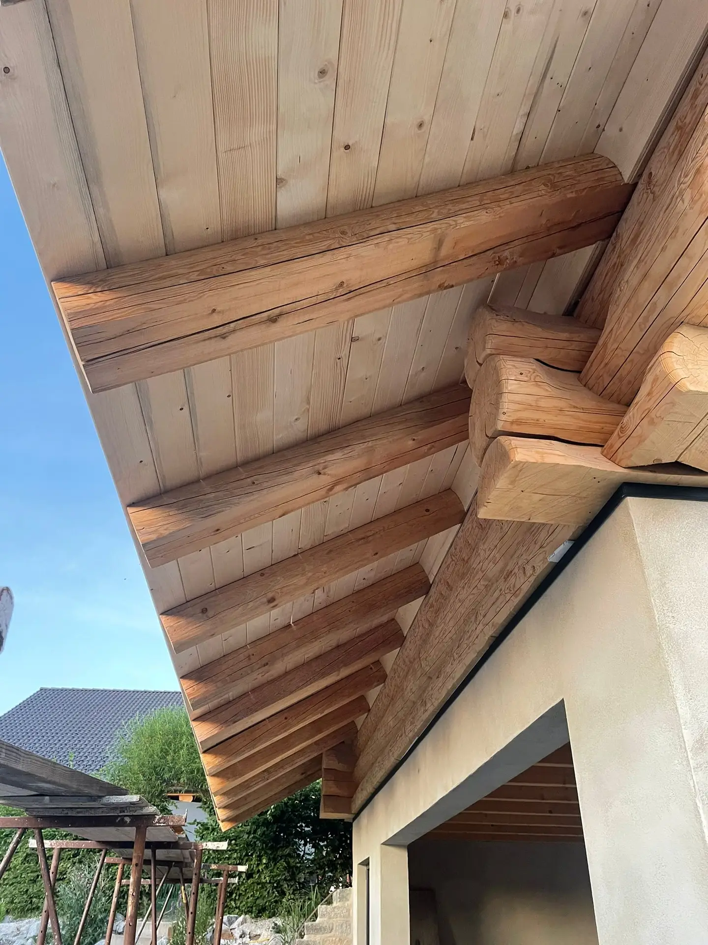 • Dźwigary z lafety: Dźwigary o grubości 18 cm zapewniają solidne wsparcie dla dachu i trwałość konstrukcji.
